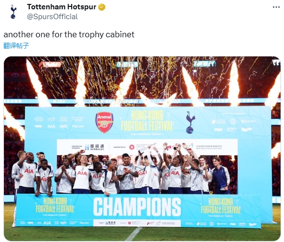 热刺官方赛后发文:奖杯排列室冠军+1。上赛季热刺夺得欧联杯冠军,本月他们还将在欧超杯对阵巴黎。