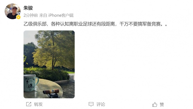 今天,朱骏在个东谈主微博晒照,他同期配文:乙级俱乐部,多样剖析辞工作足球还有段距离,千万不要搞武备竞赛。。