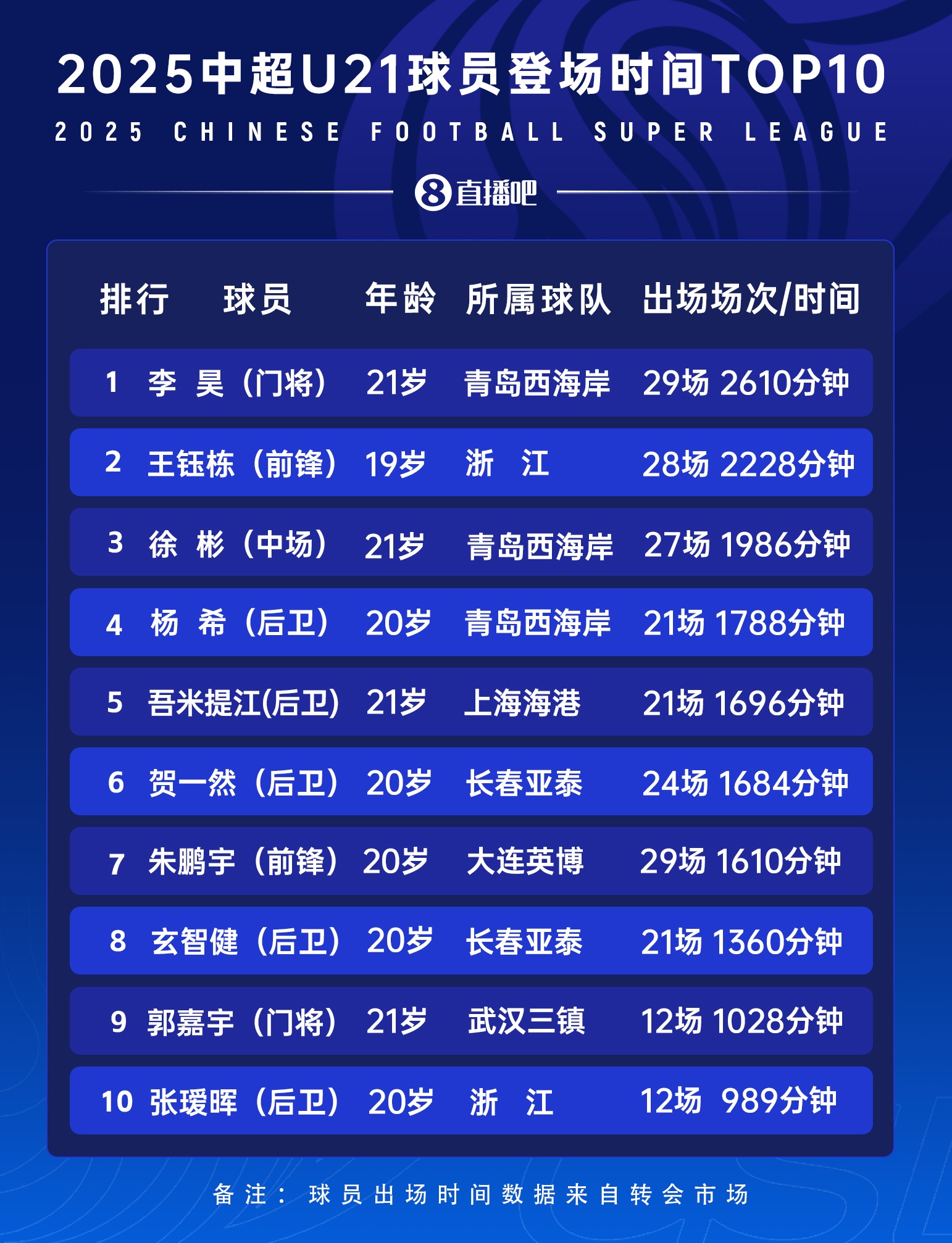 本赛季中超,16支球队使用过62名U21球员。为武汉三镇出过场的U20球员简直可以构成一套首发威望(10东说念主),山东泰山赐与了9名U20球员出场契机,青岛西海岸和大连英博的瓜代威望中有6名U20球员,为保级而格杀的长春亚泰有5名U20球员赢得了重用,四支争冠球队的U20球员数目在3到4东说念主傍边。