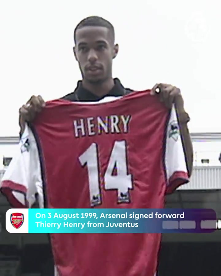 1999年8月3日,亨利以1610万欧转会费从尤文加盟阿森纳,英超官方社媒晒出亨利在阿森纳的视频集锦,配文:“亨利加盟阿森纳,一笔长期改革英超的签约。”