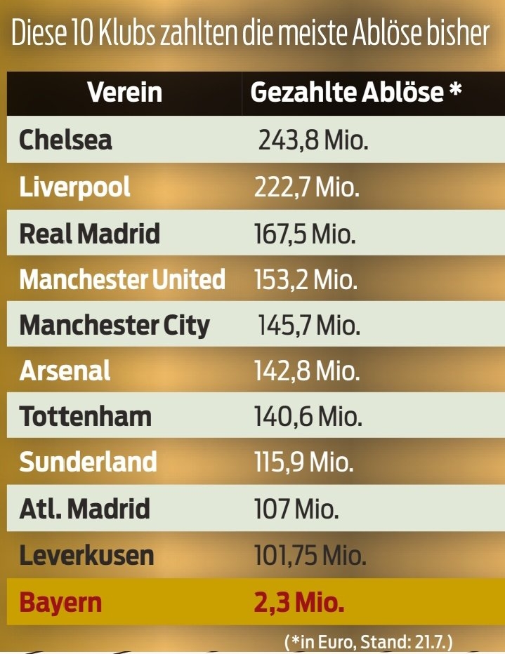 7月23日讯 有名拜仁自媒体号Bayern & Germany转载了一则今夏足坛在开销上排在前线的俱乐部盘货,拜仁被列在了最底下行为对比。