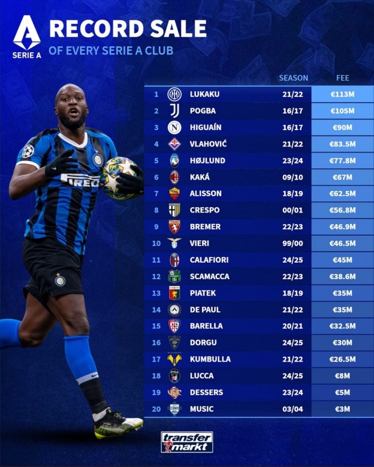 意甲各队出售球员标王排行(只录取各队最高转会费,每队一东说念主):