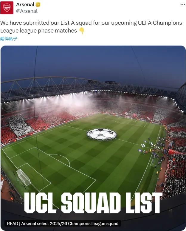 官方:阿森纳向欧足联提交了欧冠联赛阶段A名单。