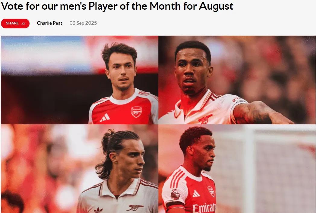 官方:祖比门迪、加布里埃尔、卡拉菲奥里和廷贝尔入选了阿森纳8月份队内最好球员候选名单。