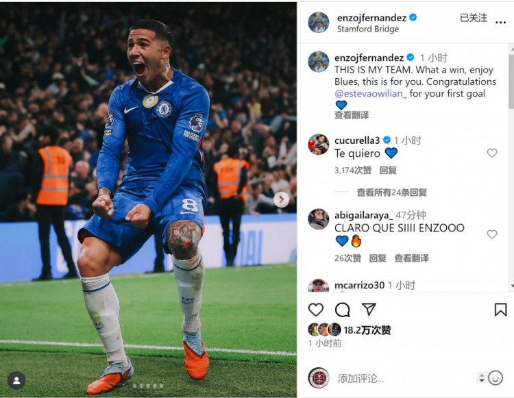 恩佐写谈:“这即是我的球队,何等奥密的见效,享受吧,蓝军球迷们,这场见效是献给你们的。道贺埃斯特旺攻入英超首球!”