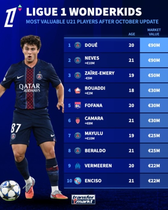 法甲U21球员身价榜:杜埃、若昂-内维斯9000万欧并排榜首