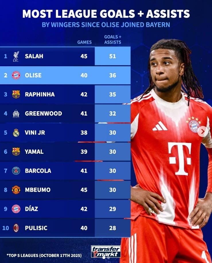 自奥利塞加盟拜仁联赛径直参与36球,边锋位置同时仅次于萨拉赫