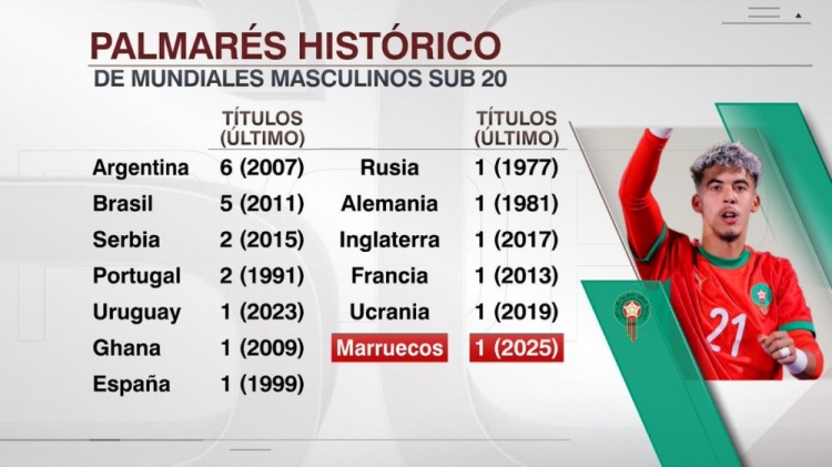 据ESPN统计,摩洛哥是第13个获取世青赛冠军的国度,而阿根廷获取6次世青赛冠军,扫数国度中最多。