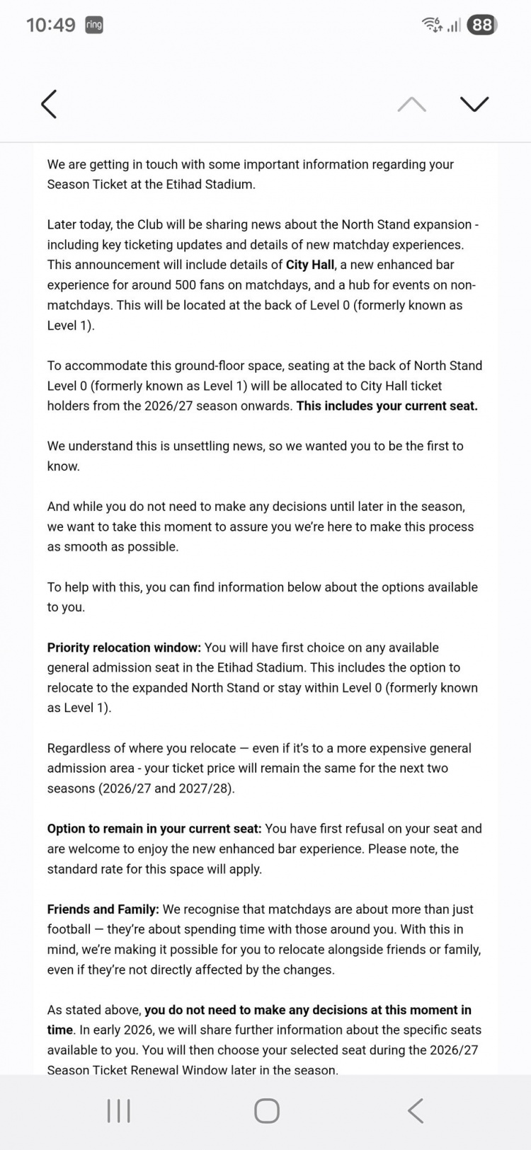 曼城俱乐部已奉告部分季票握有者,由于北看台扩建谋略,他们面前的座位将受到影响。俱乐部将在北看台0层——原1层——后部新建一个名为“市政厅”City Hall的增强型酒吧体验区及行为中心,该区域从2026/27赛季起将分拨给新的握票东说念主,这平直影响了收到奉告球迷的现存座位。