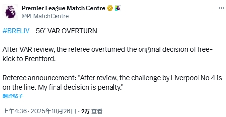 “主裁判文书:‘复核证据,利物浦4号球员的犯规发生在禁区线上。最终判罚为点球。’”