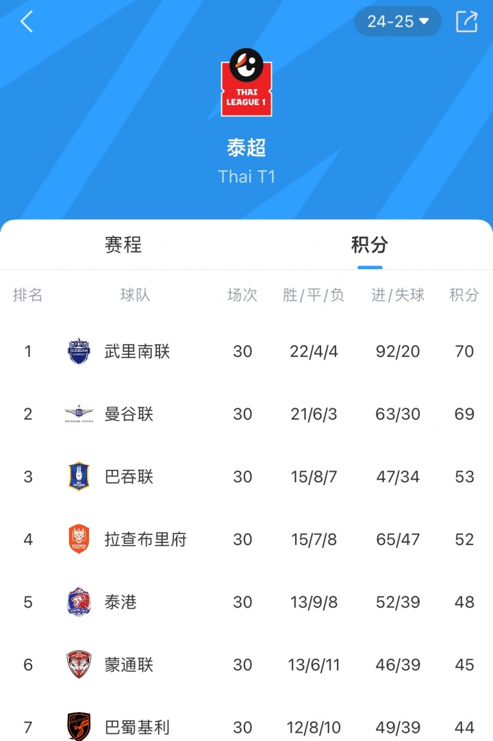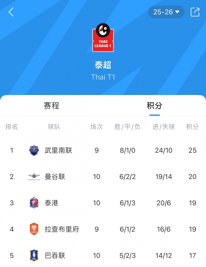 武里南联现在泰超排行↓