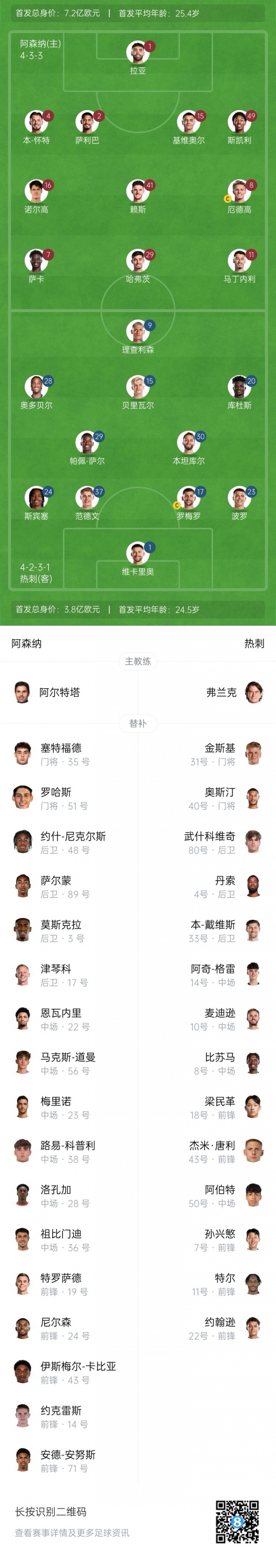 阿森纳替补:35-塞特福德、51-洛哈斯、3-莫斯克拉、14-约克雷斯、17-津琴科、19-特罗萨德、22-恩瓦内里、23-梅里诺、24-尼尔森、28-洛孔加、36-祖比门迪、38-科普利、43-卡比亚、48-尼克尔斯、56-说念曼、71-安努斯、89-萨尔蒙