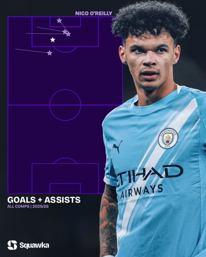 他还助攻格瓦迪奥尔破门,这意味着他在伊蒂哈德球场的最近四场英超比赛中皆有进球或助攻: