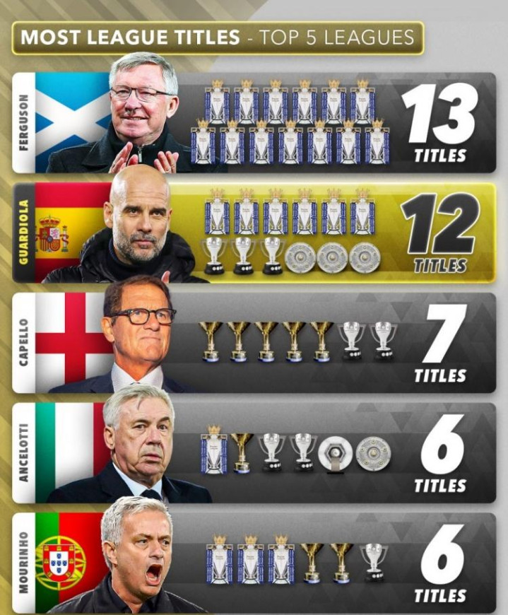 2026世界杯小组赛 瓜迪奥拉第二! 主帅联赛冠军数排名, 穆里尼奥第五, 弗格森笑了